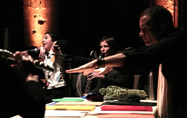 Temporary Utopia Orchestra is the umbrella name of a project which takes on its own life and identity in each creative community where it happens. For it, Nathan collaborates with a local curator who invites 12 creative performers— any mix of instruments/voices, of any skill level, stylistic background or performative artistic discipline. Nathan then leads the ensemble thru a 3-5 day workshop process, culminating in a performance. The workshop-rehearsal process is a thoroughly fun, mind-expanding, and comfort-zone-stretching learning and integration of powerful group improvisation tools and systems for fostering human connection and creating meaningful original music and/or theater in real time. When we take the stage, the language is prepared, but the content is a surprise to us all. It is fundamentally a celebration of a creative community, which the audience witnesses with empathy and laughter, much akin to watching sports.