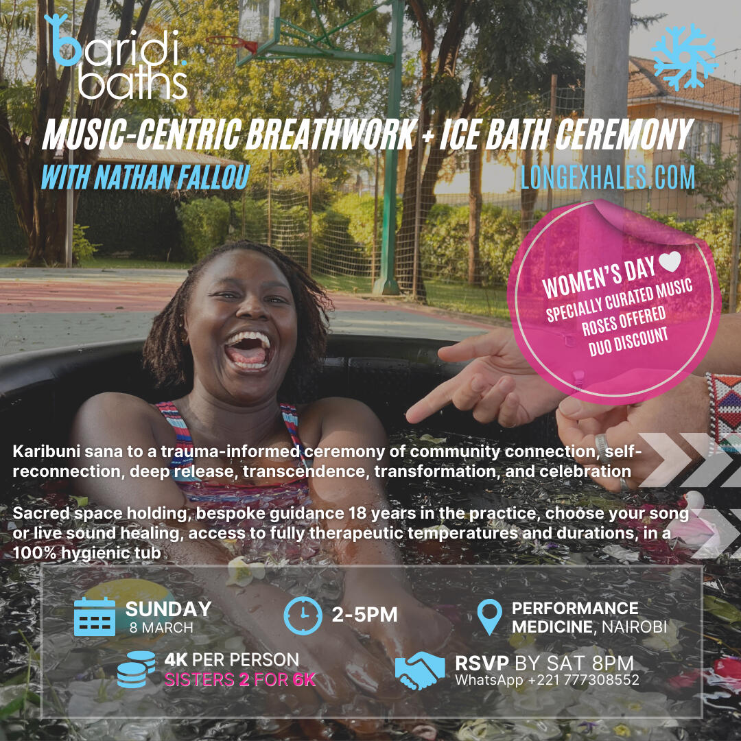 Nathan came into self-cultivation thru 2 decades of breathing, healing, growing and creating with the rhythms, drums, dance, grace— and much more only expressible in Wolof language— of Senegalese culture. In Dakar, he was the adoptive son and final collaborator of UNESCO ‘Living Human Treasure’ godfather of Sabar medicine drumming Doudou Ndiaye Rose, founding director of Deggi Daaj International Festival of Drums & Dance, DaKemistry Orchestra of transdisciplinary improvisation systems, and co-founder of the city’s first modern yoga studio, Prism Yoga. While covid restrictions destroyed what he built in Dakar, Marrakech has remained his 2nd home since 2+ decades, where he collaborates co-creating wellness retreats and performs with the Gnawa brotherhood.Beyond the continent, during summer breaks in Europe, he is also the founder and director of Demonshaker, a 6-drumset circle orchestra offering western audiences a demystified experience of healing trance.In Dar es Salaam he is the founder of the Serebuka Orchestra. In Mexico during covid, Tanzania since 2022, Morocco since 2024, and presently in Kenya, he has seeded a culture of Music-centric Breathwork + Ice Bath ceremonies.He holds a Master’s in Orchestral Conducting, with minors in Non-Western Percussion and Composition, from the Conservatory of Amsterdam, and a diploma in African Trance Dance from L’Ecole des Sables in Senegal. The Baltic Sea of Estonia was his cold therapy teacher in the winter of 2008. A son of a paramedic turned yoga teacher, godson of Prince (the music star), lifelong surfer and musician, he’s also passionate about singing, group improvisation games, intentional brotherhood, and The Four Agreements.