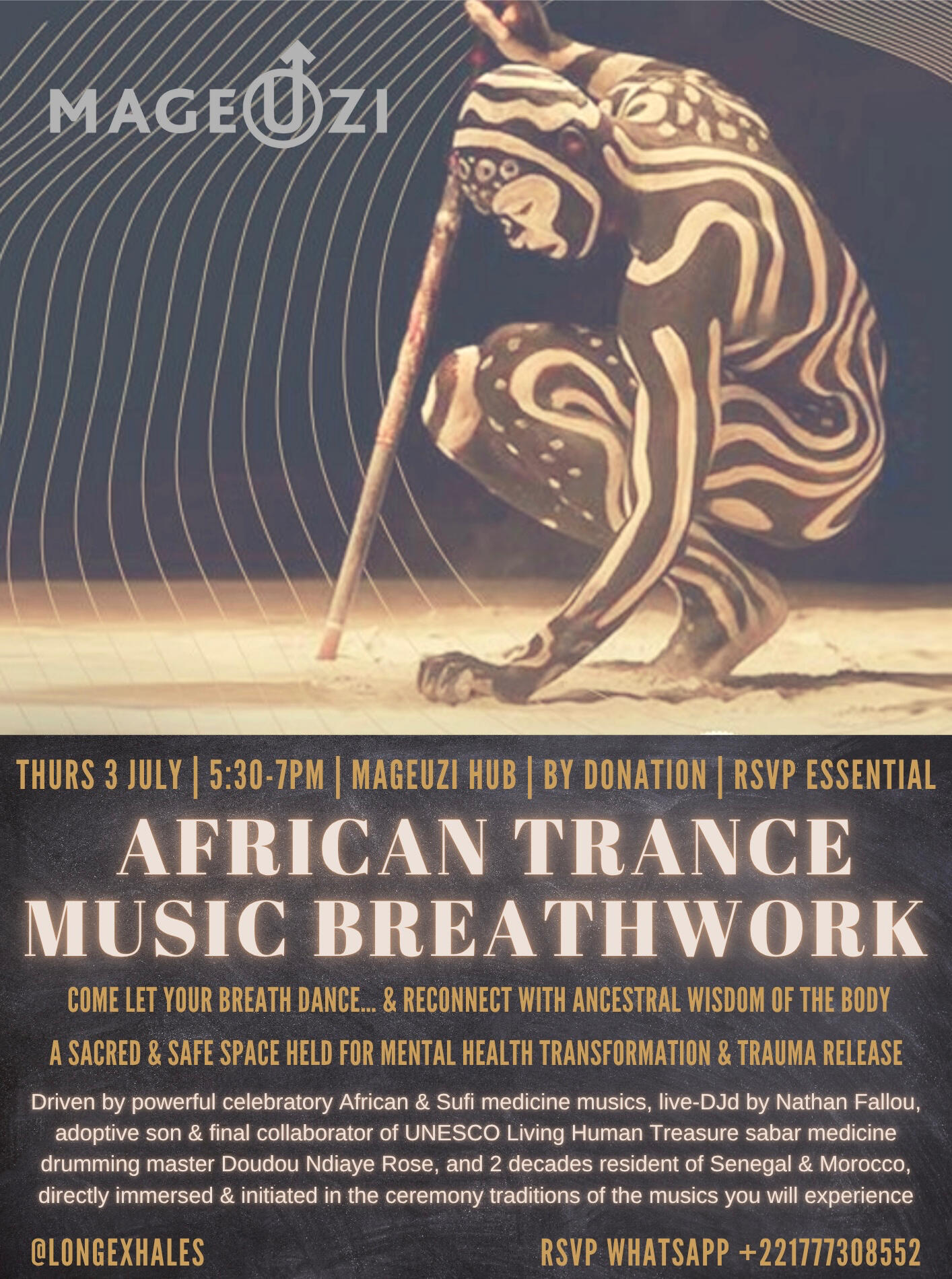 The African Trance Music Breathwork ceremony is an active meditation journey of deep release, driven by musics which communicate directly to the body, breath, and soul. The music is live DJd and live sung by Nathan. Trauma informed, and supported by immaculate quality essential oils, palo santo, white sage, and big love. A preparation guidance PDF of mindset and physical approach is sent upon RSVP. Integration guidance and support is provided afterwards.Nathan's method is a paying forward of his own practice, of over 2 decades immersive experience in the somatic demystification of the healing trance music and dance ceremony traditions of the Gnawa in Morocco, Sabar in Senegal, and Sufi Zikr in Egypt. Sacred musics which invite the breath to dance, thru their circularity of rhythm and physicality of sound. It is also rooted in the lifelong influence of pranayama breathing practices from his yoga teacher mother.In his words: I was being requested by collaborators in Europe to ''make something" to offer from Africa. Which didn't resonate with me, as my calling on the continent was a personal healing and growth journey, absolutely not to commodify or extract. The requests continued over the years, and I generally disregarded them. In a Vipassana meditation retreat— 10 days of silent meditation, in which Leonard Cohen's verse about "Jesus was sailor..." was stuck in my head, until— day 6, when it came to me, most unexpectedly... I will pay forward my breathwork practice.