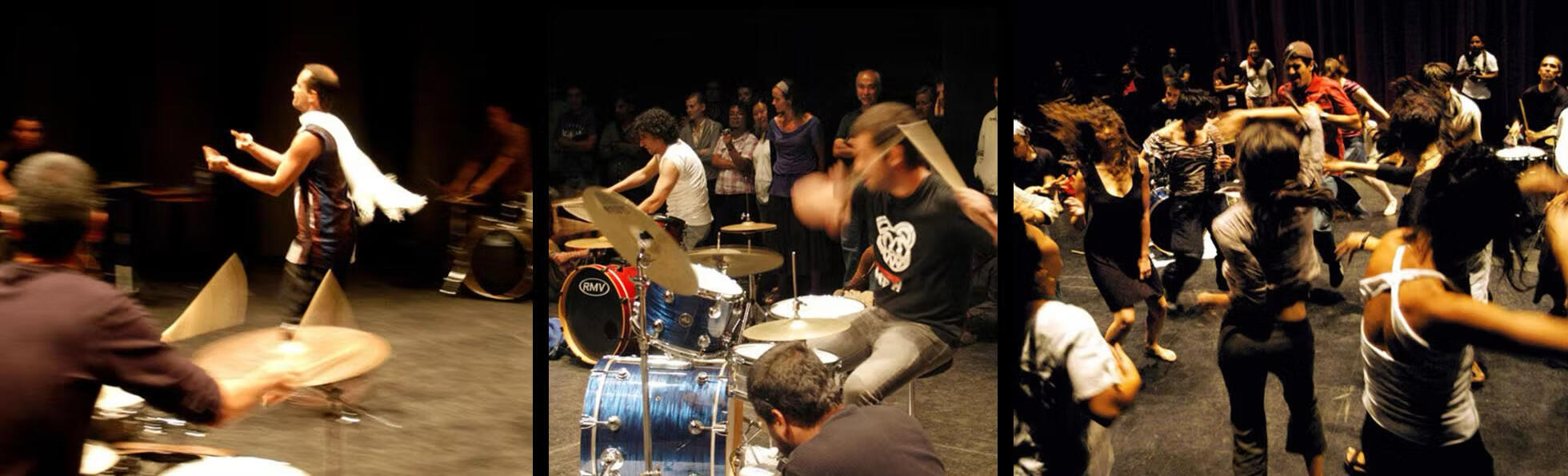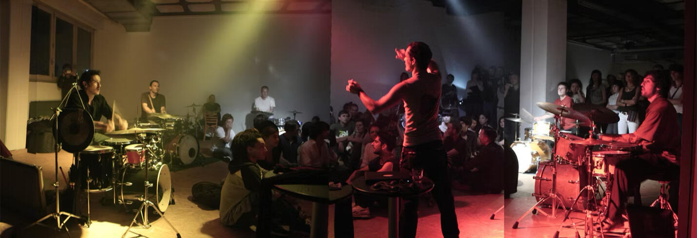 Demonshaker is a 6-drumset circle orchestra offering western audiences a demystified experience of healing trance, thru physicality of sound and circularity of rhythm. For it, Nathan created a gestural conducting language which favors invitation and choice, rather than command and control. A shamanic sculpting of supremely charged flow states. Demonshaker is a sonic purification and celebration of release & community. The creation process takes the form of a 1 week workshop with locally curated professional drummers resulting in a performance. It has been hosted numerous times in Berlin and Lisbon, and also in Oaxaca, Mexico and Sofia, Bulgaria.