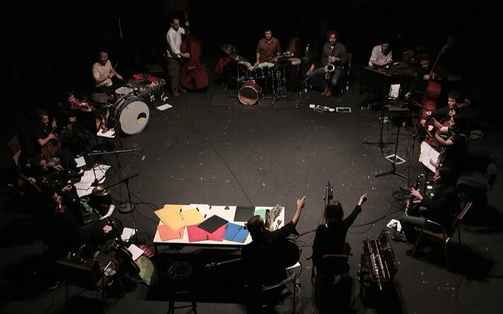 Nathan is the artistic director and conductor of the ensemble, but to my eyes he is much more a performer himself. His way of gathering the band members’ energy and redistributing it back with specific signals and movements has more to do with dance, martial arts, or even shamanism… This is not free or even interpretive improvisation— the visceral clarity and physicality of his directing almost seem to declare war on the well-run territory of improv sans language, which is not to say that he does not balance such command with moments of making himself fluid or invisible, trusting players’ own commands, letting the music just breathe, or even sharing laughter.He brought John Zorn's Cobra as it should be but rarely is— not as a demonstration of a game system (which is admittedly completely entertaining and engaging in itself) or a representation of its legendary creator, but fully present and recognizing the immediate unique chemistry and latent interactive potential of 13 diverse individuals assembled on the stage in front of him, and using Cobra as a language through which their creative energies flow, collide, synergize and grow exponentially.And there is a certain social alchemy at work here too in the way he brings these people together, in that these are all first-class musical personalities well-known from different respective scenes in Holland (including guests from Paris and New York) who otherwise might never be found in the same room together. It is from the beginning a highly combustible presentation of personal comfort zones shared, stretched, resculpted, or sometimes simply violated until their respective borders are transcended into a collective creative ecstasy. This presentation was framed and drawn into harmony by Fuhr's way, upon entering the space, of establishing terms in non-verbal communication with audience and his ensemble alike, palms together just below present eyes, with the grace and selfless air reminiscent of an Indian classical musician— a balancing yin to the red-hot yang energy of the performance itself.— Francisco Gonzalez