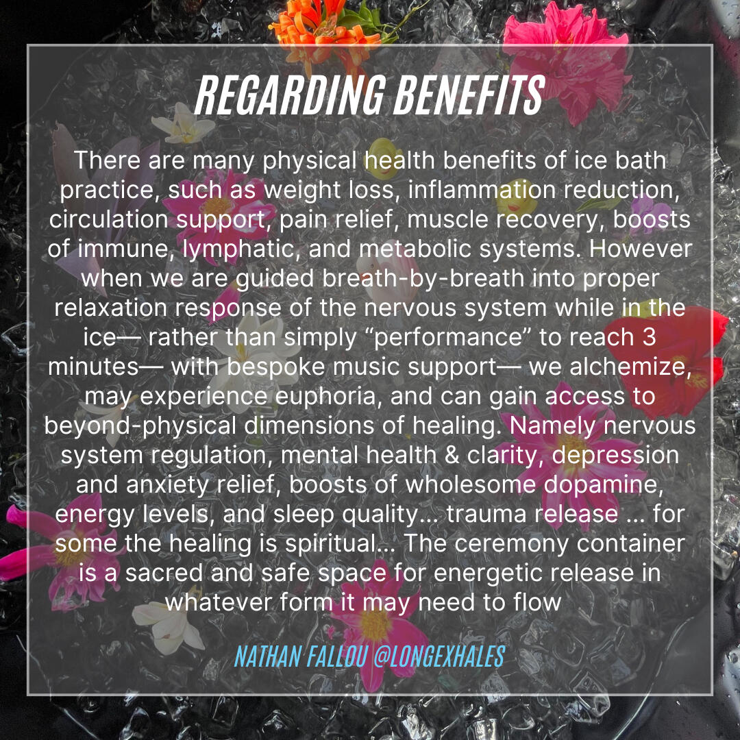 Nathan's primary cold therapy method of Music-centric Breathwork + Ice Bath Ceremony focuses on the single goal of relaxation response of the nervous system while in the ice, guided breath-by-breath. In contrast to the 1-dimensional focus on duration primarily, found in popular ice bath culture. This is in order to access full-spectrum beyond-physical health benefits as well, including mental health transformation and the potential of trauma release from the body. In his method bespoke music support is also integral, as only you know the soundtrack, sound healing, affirmations, or silence to best synergize with your intentions. Accordingly, there is also an emphasis on the safe space of smaller ceremony groups and personalized guidance. The circle holds space for each other with absolute compassion and zero judgement... with participant intentions ranging from BJJ fight preparation and muscle recovery, to grief processing and chasing healthy dopamine. Wholesome community connection is a central value, and groups often flow to dinner together afterwards.