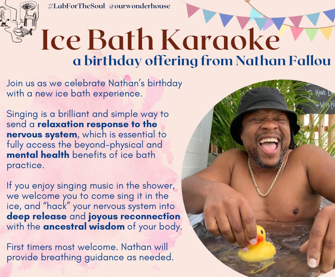 His secondary cold therapy method of Ice Bath Karaoke is also rooted in this intention, however thru singing as the focus to wholesomely move the breath and send the essential signal of relaxation response to the nervous system. This session does not include a 30 minute breathwork deep dive as in the ceremony, but individual bespoke breath guidance is provided before and during your song plunge.