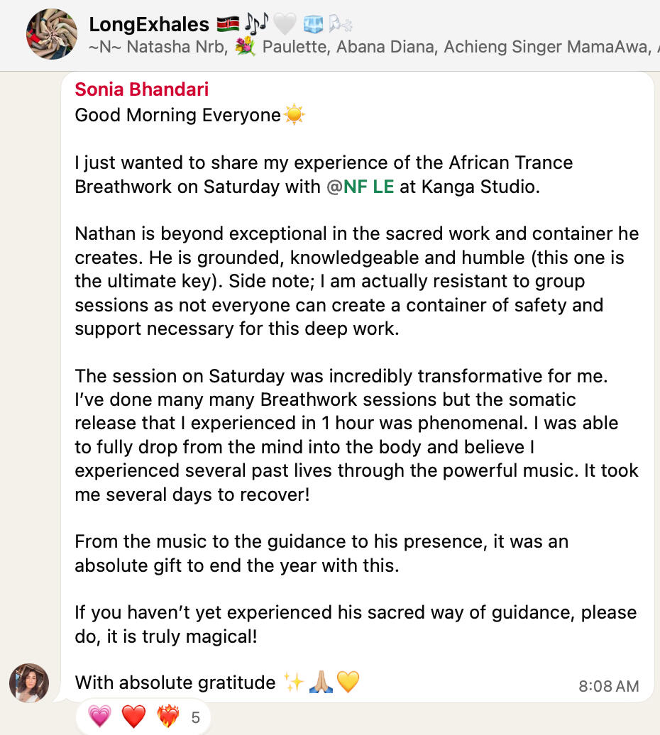 Nathan came into self-cultivation thru 2 decades of breathing, healing, growing and creating with the rhythms, drums, dance, grace— and much more only expressible in Wolof language— of Senegalese culture. In Dakar, he was the adoptive son and final collaborator of UNESCO ‘Living Human Treasure’ godfather of Sabar medicine drumming Doudou Ndiaye Rose, founding director of Deggi Daaj International Festival of Drums & Dance, DaKemistry Orchestra of transdisciplinary improvisation systems, and co-founder of the city’s first modern yoga studio, Prism Yoga. While covid restrictions destroyed what he built in Dakar, Marrakech has remained his 2nd home since 2+ decades, where he collaborates co-creating wellness retreats and performs with the Gnawa brotherhood.Beyond the continent, during summer breaks in Europe, he is also the founder and director of Demonshaker, a 6-drumset circle orchestra offering western audiences a demystified experience of healing trance.In Dar es Salaam he is the founder of the Serebuka Orchestra. In Mexico during covid, Tanzania since 2022, Morocco since 2024, and presently in Kenya, he has seeded a culture of Music-centric Breathwork + Ice Bath ceremonies.He holds a Master’s in Orchestral Conducting and Non-Western Percussion from the Conservatory of Amsterdam, and a diploma in African Trance Dance from L’Ecole des Sables in Senegal. The Baltic Sea of Estonia was his cold therapy teacher in the winter of 2008. A son of a paramedic turned yoga teacher, godson of Prince (the music star), lifelong surfer and musician, he’s also passionate about singing, group improvisation games, intentional brotherhood, and The Four Agreements.
